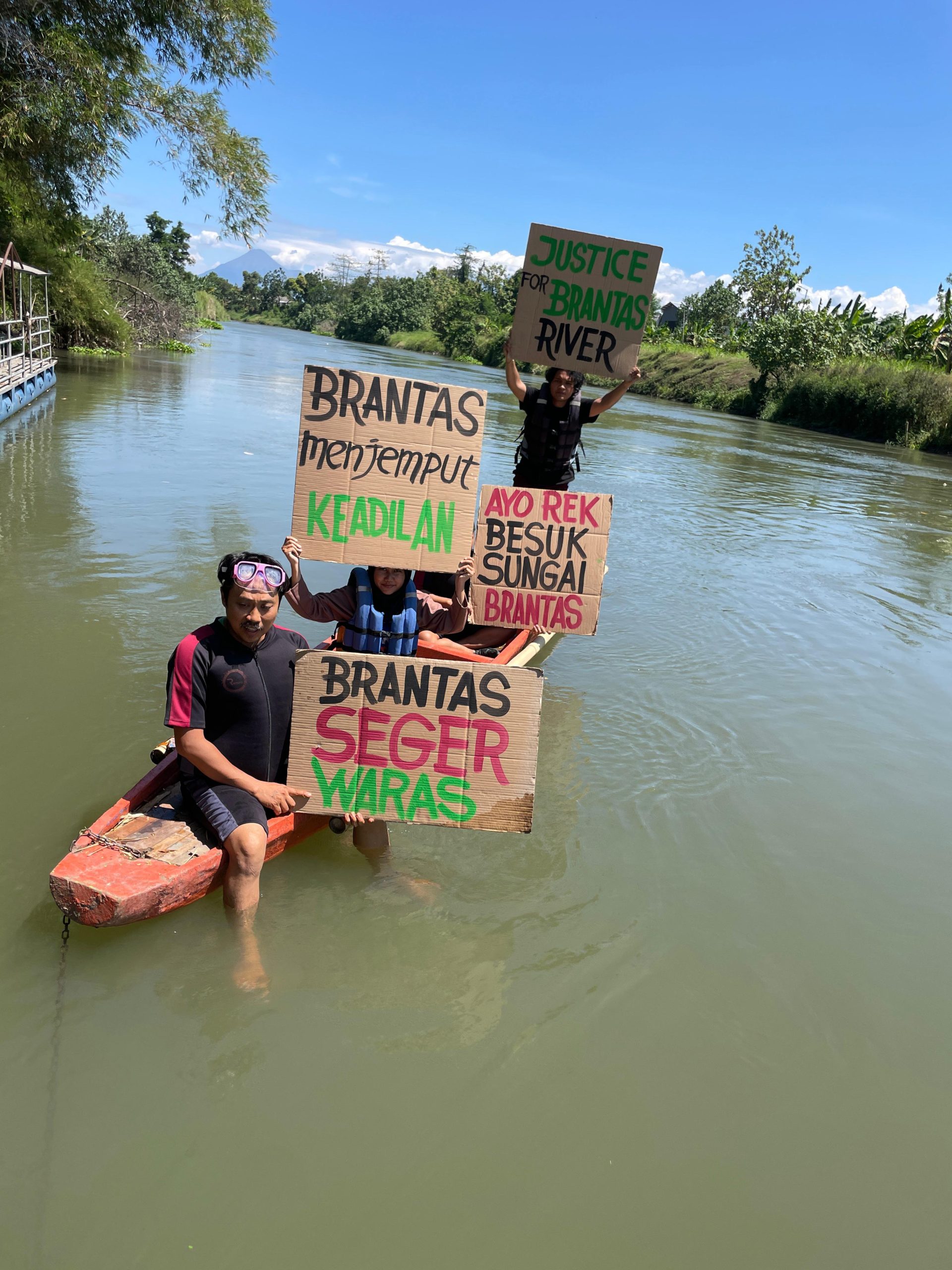 Para aktivis membawa poster bertuliskan “Ayo Rek Besuk Sungai Brantas” dan “Brantas Seger Waras.” Mereka ingin mengajak masyarakat kembali peduli pada sungai yang menjadi sumber kehidupan warga Jawa Timur.